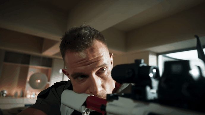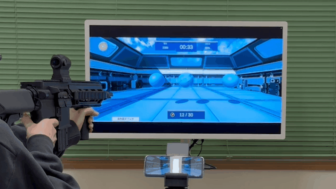 スマートフォンを銃に搭載して、銃の動きとスマホ画面が連動して射撃します。 |