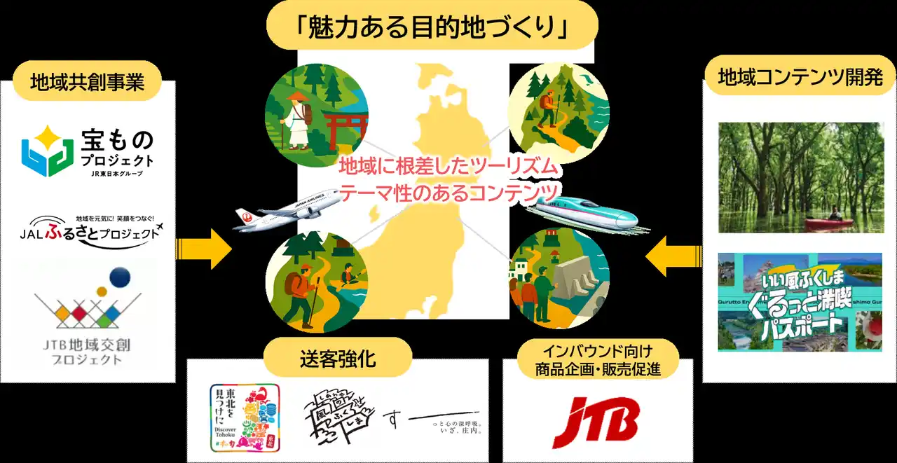 東日本大震災から15年という節目に開催するJRグループデスティネーションキャンペーン「しあわせの風ふくしま※4」やJTBグループ国内旅行キャンペーン「日本の旬※5東北」との連携により、東北エリアへの誘客促進と広域周遊の拡大を図ります。 |