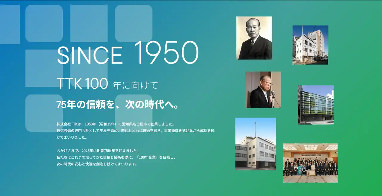 TTKは1950年に名古屋で創業し、2025年に創業75周年を迎えました。電話設備から始まった当社の事業は、時代の変化とともに情報ネットワーク、セキュリティ、そして健康社会を支えるウェルネス事業(Rakuretch)へと領域を広げてまいりました。 デジタル環境が劇的に変化する中、当社の強みである「培ってきた信頼と技術」をより分かりやすくお伝えし、次の100年へ向けてステークホルダーの皆様との繋がりを深めるべく、サイトを刷新いたしました。 |