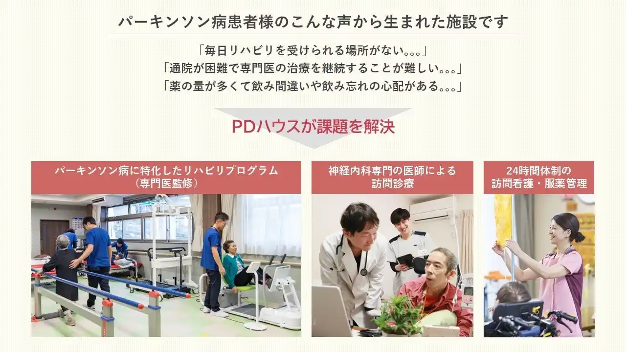 「PDハウス」は、パーキンソン病専門の介護施設です。 |