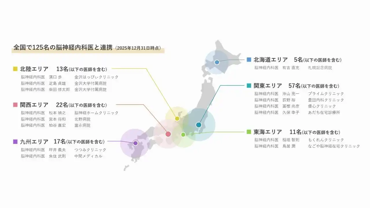 全国の脳神経内科病院と連携し、訪問診療を行う事で専門的治療を継続できる体制を整備しています。 |