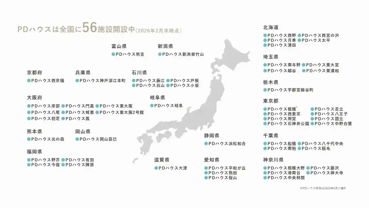 PDハウスは全国に56施設開設中(2026年2月末時点) |