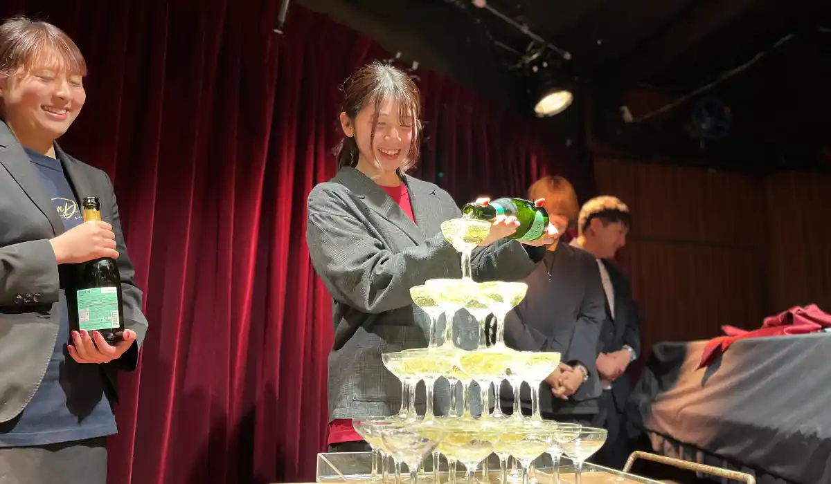 | 13:30 懇親会(シャンパンタワー、社員による余興、入社証書授与等) | |||
