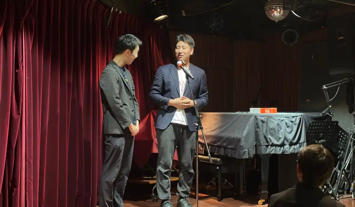 | 懇親会では、新入社員の緊張を解きほぐすため、先輩社員たちが新入社員のエピソードを交えたオリジナルの漫才を披露しました 。当社の「心理的安全性の高さ」や「フラットで温かいコミュニケーション」の文化を、言葉だけでなく体験としてご家族にも感じていただく時間となりました。 | |||