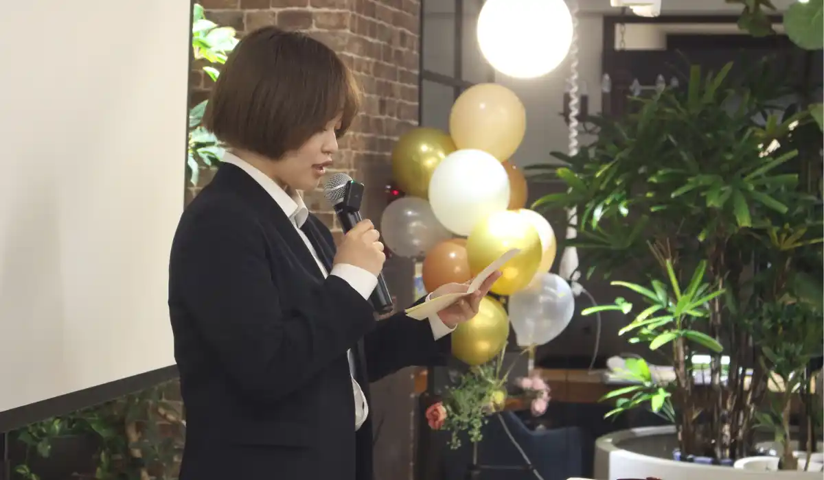 | 代表や先輩社員が見守る中、新入社員からご両親へ宛てた感謝を綴る手紙を朗読いたしました。 日頃は伝えられない想いを言葉にして伝えることで、社会人として自立する決意を固める感動的な時間となりました。 | |||