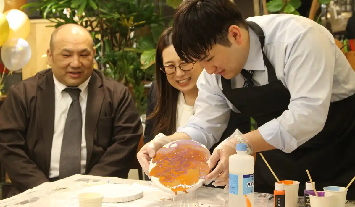 | 入社式における緊張感を和らげるアイスブレイクとして、1家族につき2枚のキャンバスを用意し、新卒社員とそのご両親が共同で「たらしこみアート」を制作しました。 | |||