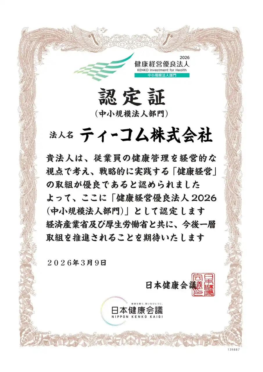 「人を想い、共に挑み、BESTを紡ぐ。未来は、笑顔で拓こう。」をコンセプトに、ロジスティックス業務からICTソリューション、ソフトウェア開発、テクニカルサポートまで、幅広いIT関連サービスを提供するティーコム株式会社(本社:東京都港区、代表取締役社長:岡松美樹)は、2026年3月、「健康経営優良法人2026」に認定されたことをお知らせいたします。
