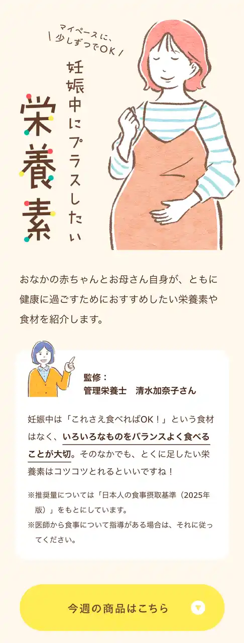 1. 鉄分・葉酸を効率よく。管理栄養士監修の商品紹介 管理栄養士の清水加奈子さんが監修し、妊娠中の摂取が推奨される「鉄分」「葉酸」「たんぱく質」を、日々の食事で無理なく補える商品を紹介します。栄養素の重要性を解説し、納得感のある商品選びをサポートします。 |