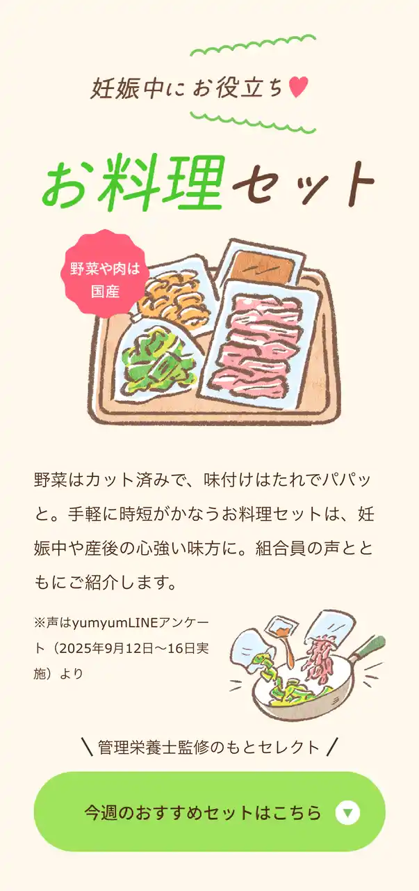 2. 産前・産後の時短に「お料理セット」を提案 調理負担を軽減し、時短と栄養バランスを両立できる「お料理セット(ミールキット)」の活用法を提案します。パートナーとの家事シェアにも役立つ、手軽で安心な食卓づくりを応援します。 |