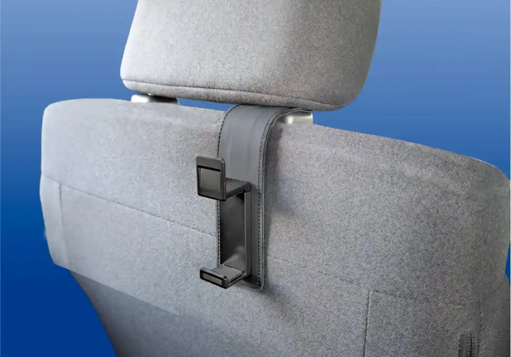 ヘッドレストのポールに引っ掛けるだけの簡単装着。 特別な工具は不要で、どなたでも手軽に取り付けが可能です。 縫製部分は、高級感のあるPUレザーを採用、金属板内蔵でシート形状に沿ってまげることができ、柔軟にフィットします |