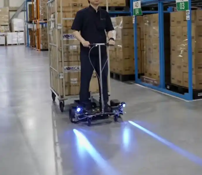 | 歩くことなく搬送を可能に:台車に「乗る」事で性別、国籍問わず幅広い方の「歩行」を大幅軽減。現場環境の向上と同動速度向上に伴う生産性向上へ繋げます。搬送速度上限は7km/10kmよりお選び頂けます。 | |||