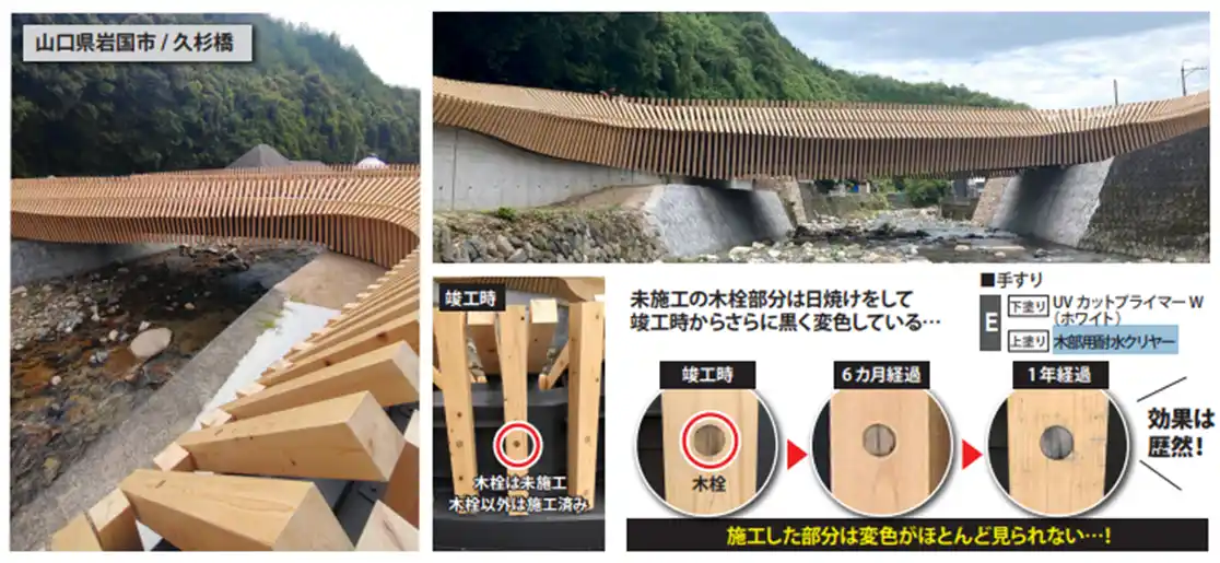 山口県岩国市にある、建築家・隈研吾氏が手がけた「久杉橋(くすぎばし)」。その象徴ともいえる木製の手すり部分には、染めQテクノロジィの技術が活用されています。木材の美しさを守るため、「UVカットプライマー」と「木部用耐水クリヤー」を木部に塗布。これにより、木の質感を損なうことなく、強固な防水加工と紫外線対策を実現しています。 |