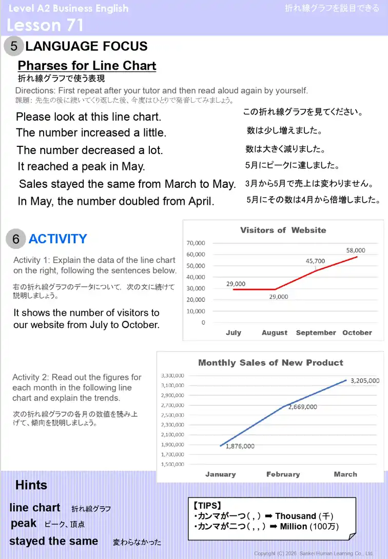 また、ビジネスの現場で意思決定の鍵となるのは「数字」の扱いです。特に大きな数字の表現は、日本語と英語で桁の区切り方が異なるため、中級者にとっても聞き取り・発話ともに難関となります。本カリキュラムでは、こうした数字の扱いや、オフィスで多用されるグラフ・図表の説明に関する「型」を習得し、正確に情報を伝える力を養います。 |