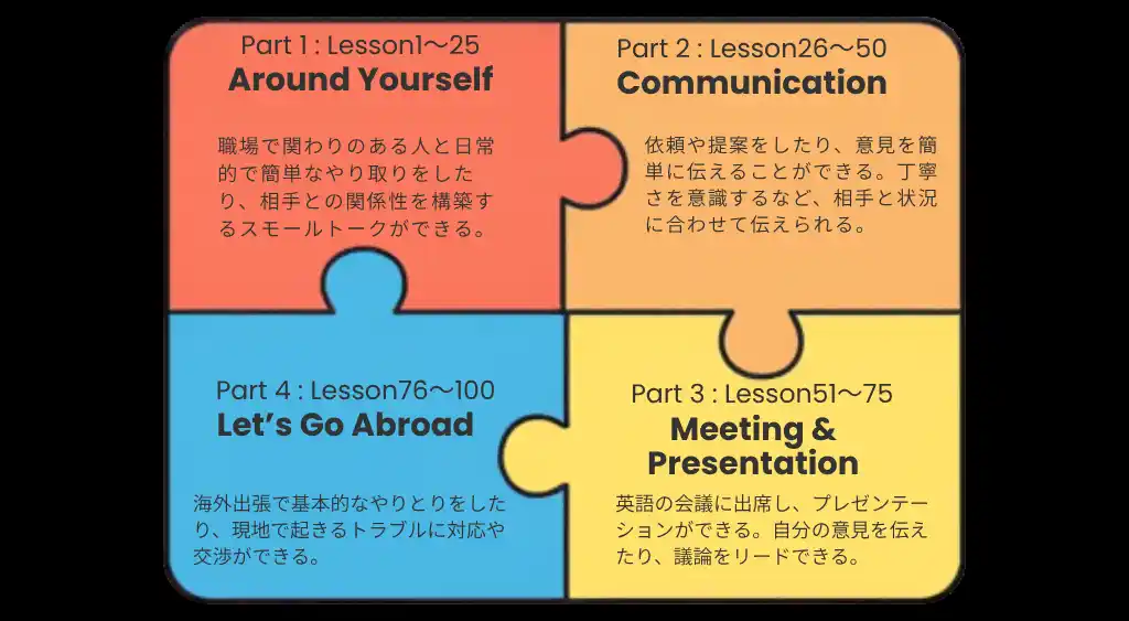 今回のリニューアルでは、A1/A2/B1コースの後半(レッスン51~75)の内容を「会議の英語」に特化した構成へと刷新いたしました。オンライン会議で欠かせない必須表現をはじめ、最新のオフィス業務に即したシーンを数多く盛り込んでおります。 |