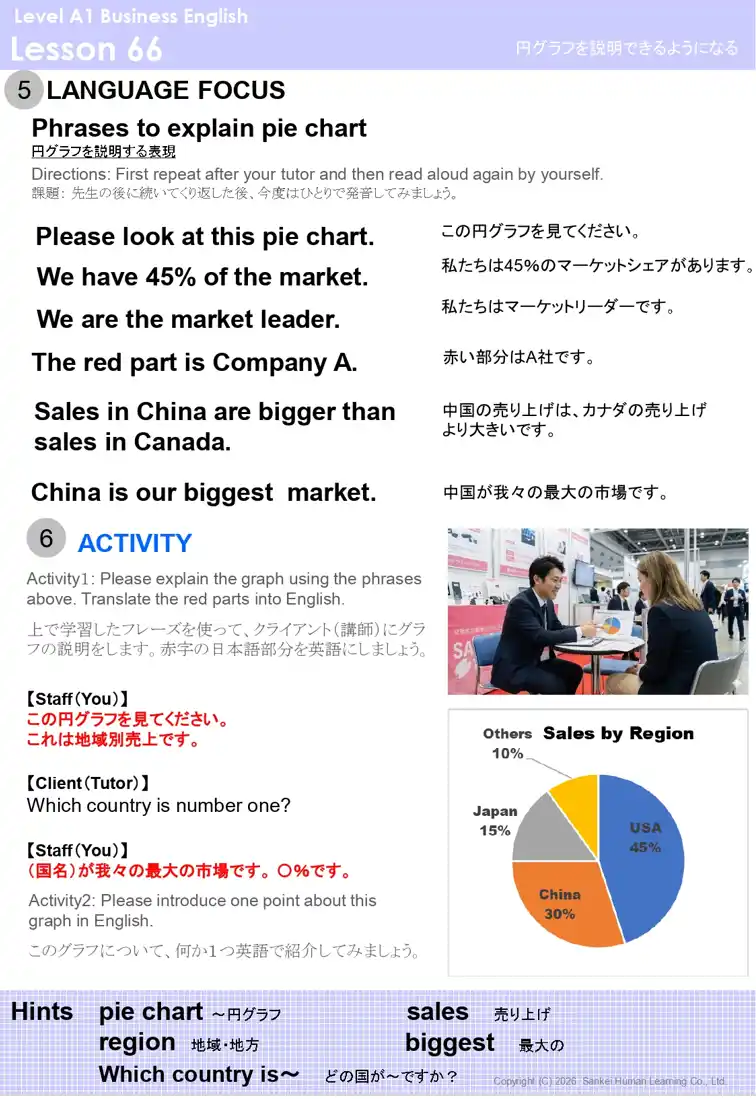 特にリニューアルしたA1/A2/B1コースの後半、レッスン51~75「Meeting&Presentation」パートでは、この「会議の英語」の力をつける内容に刷新しました。「数字」「グラフや表」を説明できる力を身につけると共に、オンライン会議での必須表現など、最新のオフィス業務で役立つシーンが盛り込まれています。 |