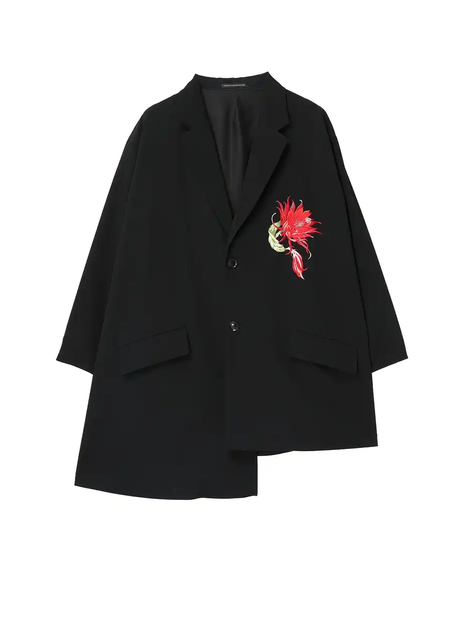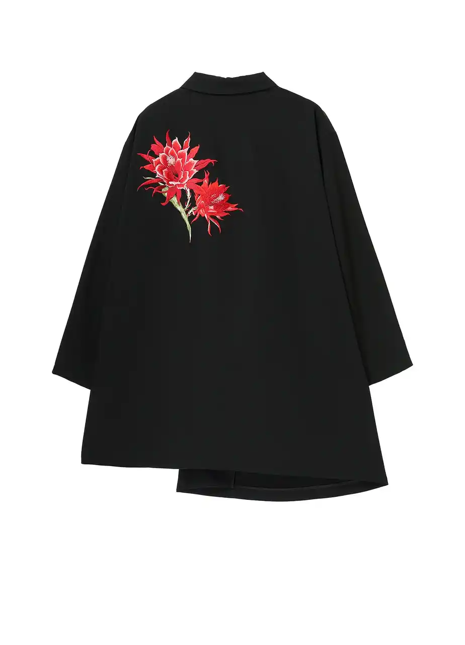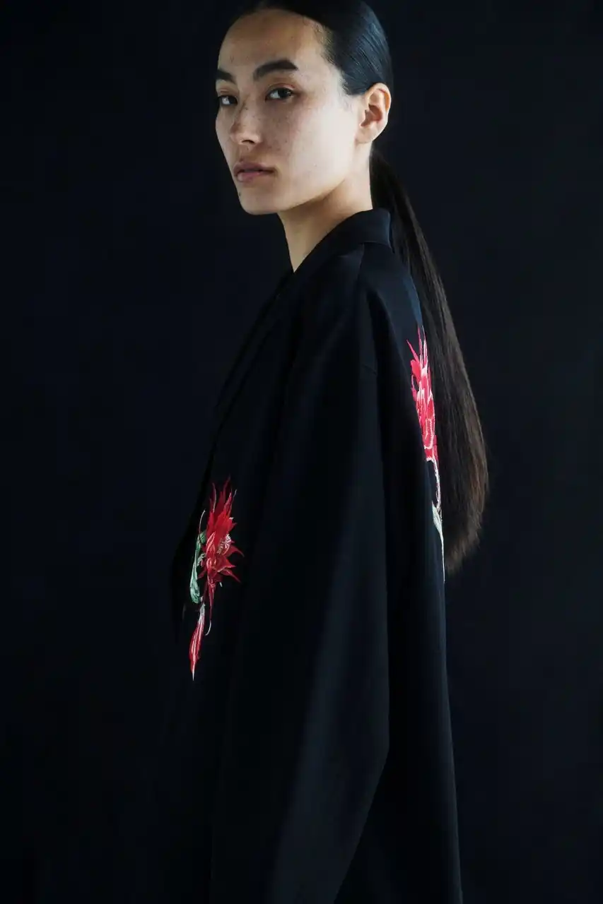 立体的なボリュームと温かみ、微妙な個体差のある手振り刺繍を施したウールギャバジンジャケット。刺繍は角度によって表情や色合いが微かに揺らぐ。アシンメトリーなシルエット。 |