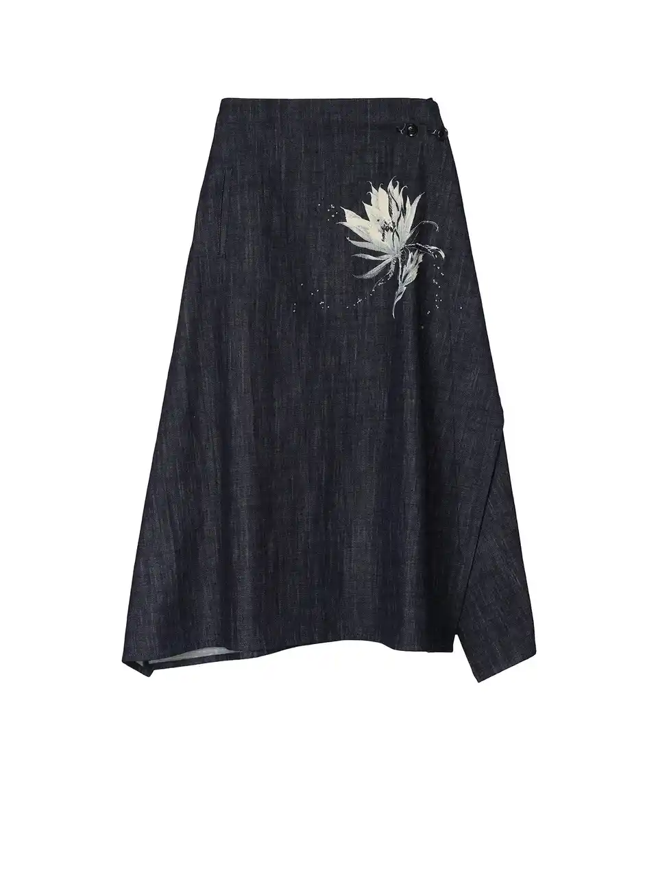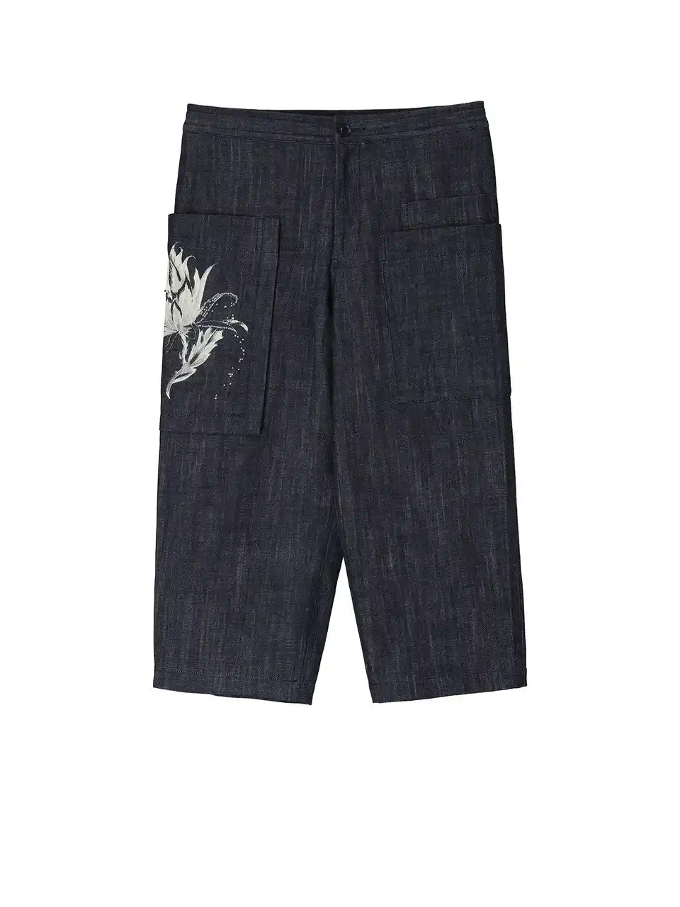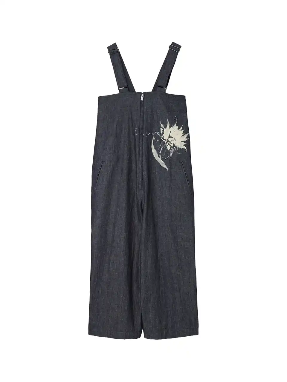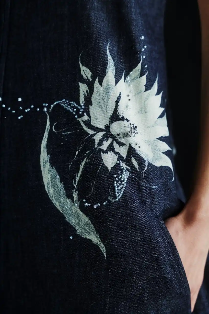 デニム生地にサボテンの花を抜染プリントし、柄に合わせてビーズが散らばるように刺繍を施した。 |