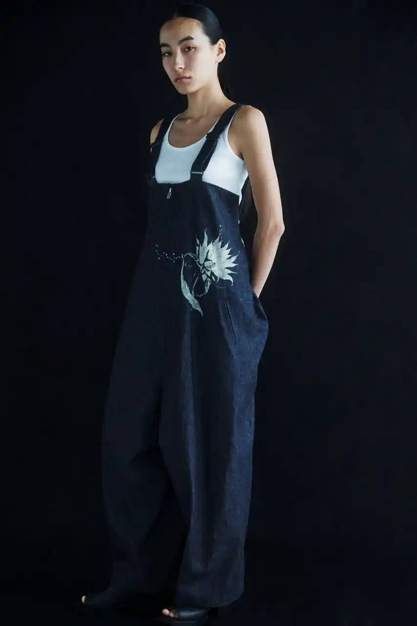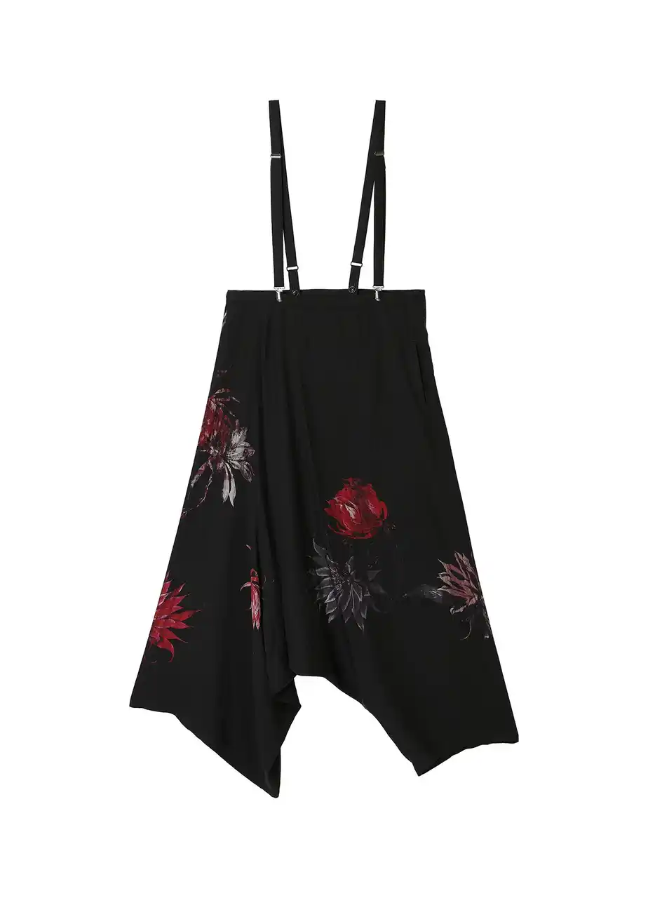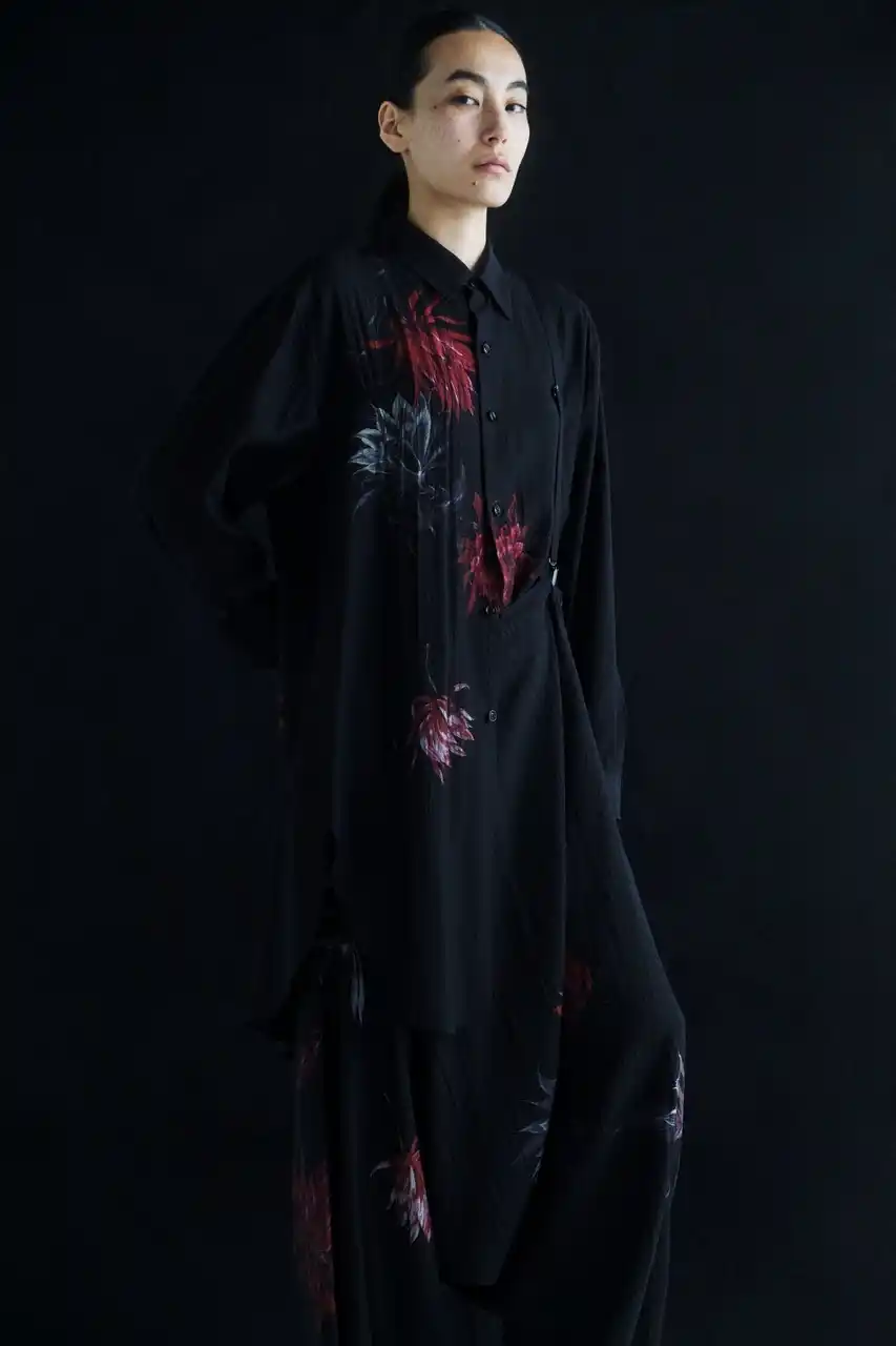 サボテンの花を不規則に配したブラウスとサスペンダー付きパンツ。光沢と落ち感のあるキュプラ素材に花のトーンの差や掠れ感が奥行きを描く。 |