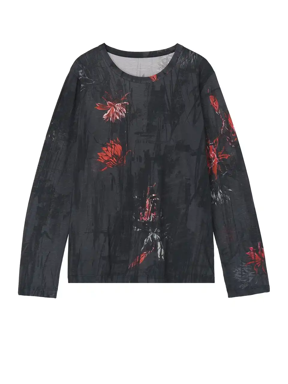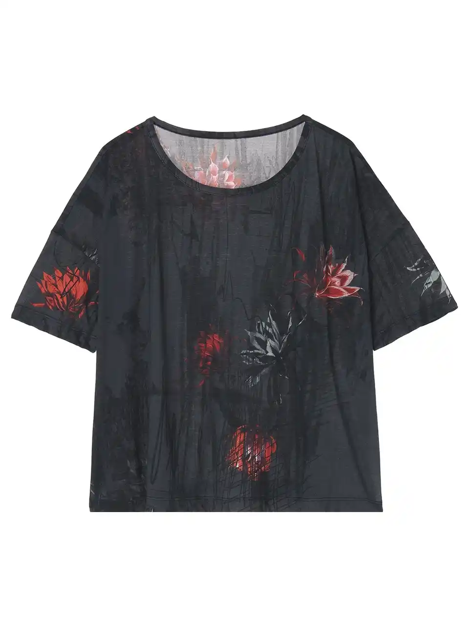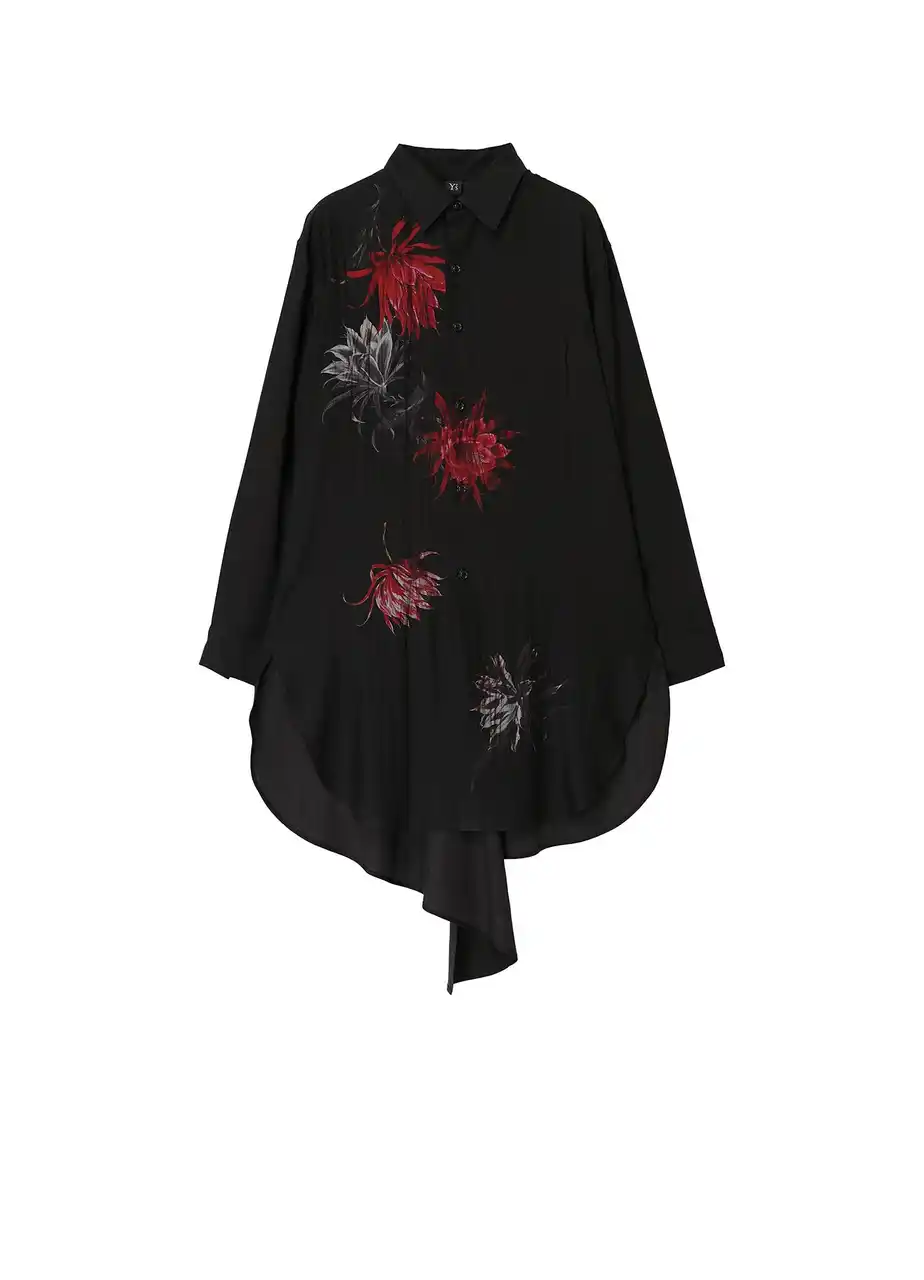 サボテンの花を不規則に配したブラウスとサスペンダー付きパンツ。光沢と落ち感のあるキュプラ素材に花のトーンの差や掠れ感が奥行きを描く。 |