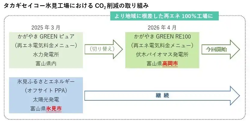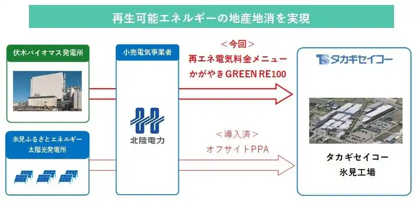 タカギセイコー氷見工場では、2025年3月より、氷見ふるさとエネルギー株式会社(以下、「氷見ふるさとエネルギー」)の太陽光発電所の電力をオフサイトPPAで調達し、あわせて北陸電力の再エネ電気料金メニューである「かがやきGREEN ピュア」を導入することで、すでに再エネ100%を実現しています。今回、利用する再エネ電気料金メニューを「かがやきGREEN RE100」に切り替え、高岡市に所在する伏木バイオマス発電所由来の環境価値を活用することで、より地域に根差した再エネ100%の工場へと進化します。 |