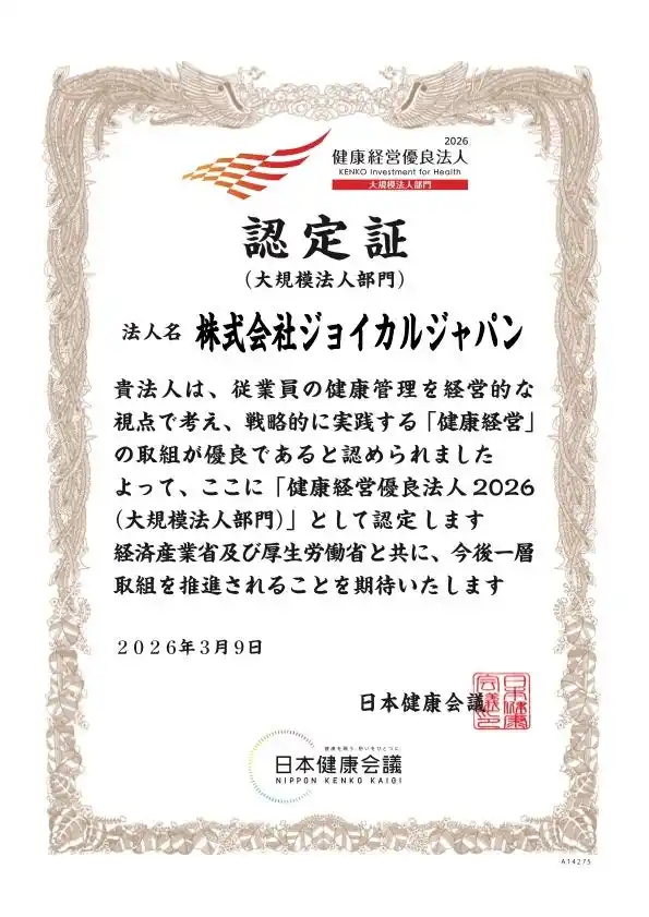 株式会社ジョイカルジャパン(本社:東京都千代田区/代表取締役社長 CEO 早川 由紀夫、以下:ジョイカルジャパン)は、2026年3月9日付で、経済産業省および厚生労働省、日本健康会議が選定する「健康経営優良法人2026(大規模法人部門)」に3年連続で認定されましたことをお知らせします。