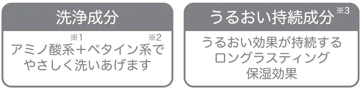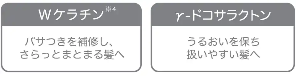 シャンプーではアミノ酸系洗浄成分※1とベタイン系洗浄成分※2を組み合わせ、やさしさと洗浄力のバランスを考慮しました。トリートメントには毛髪補修成分Wケラチン※4や毛髪補修成分γ‐ドコサラクトンを配合することでパサつきを補修し、さらっとまとまる髪へ導きます。 |