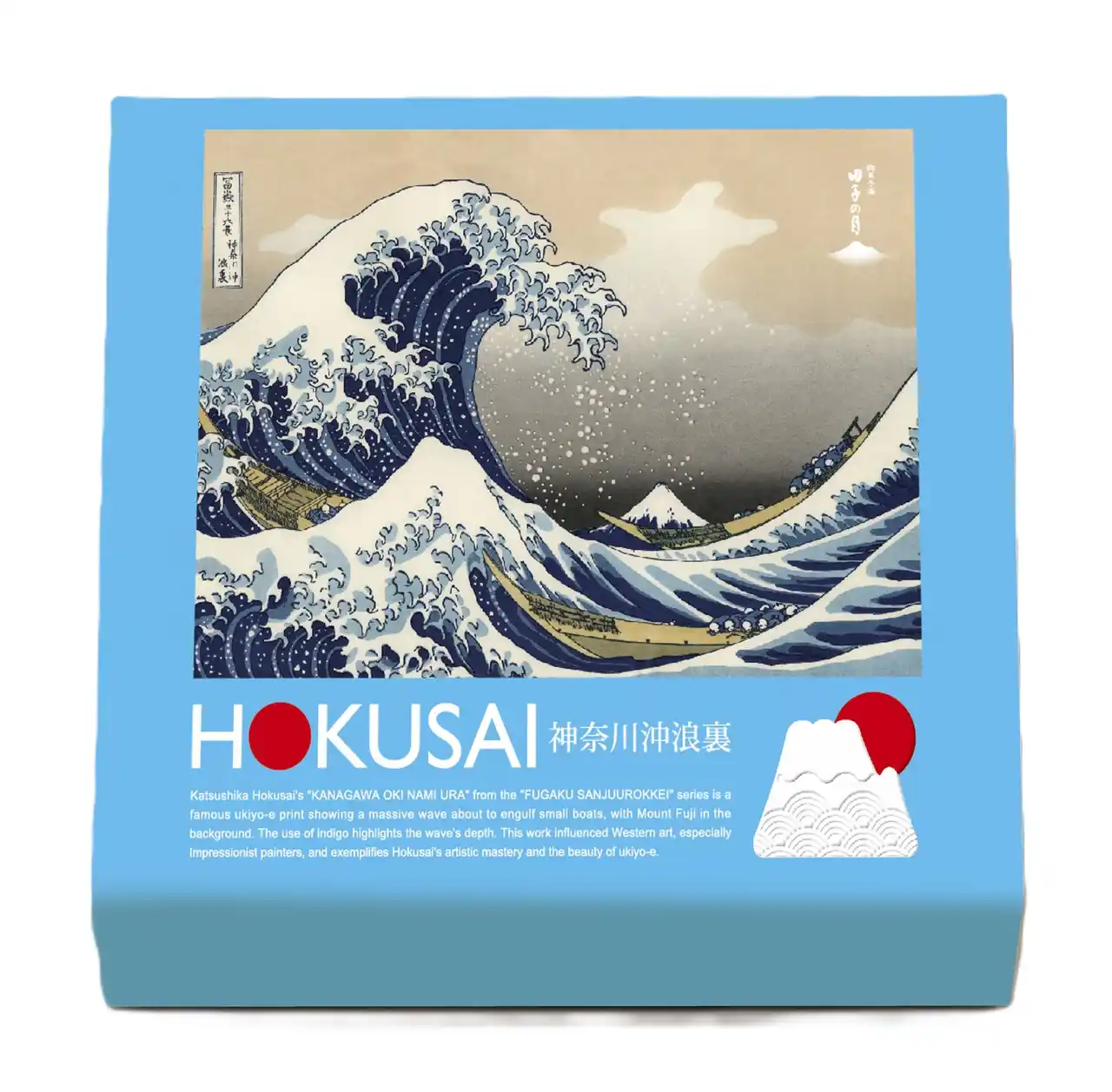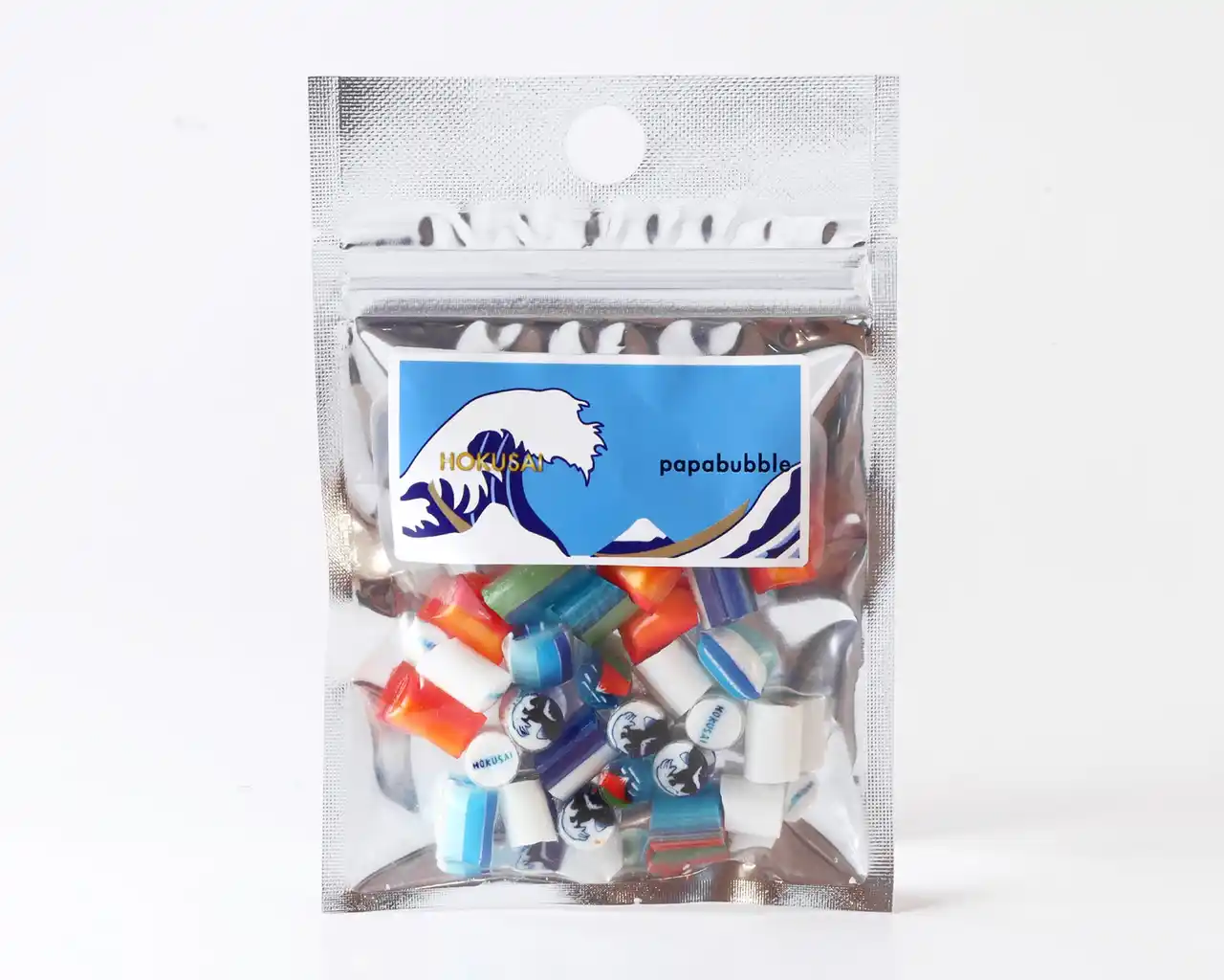 北斎による「富嶽三十六景」の中でも特に有名な2作、「凱風快晴(赤富士)」と新千円札の図柄にも採用された「神奈川沖浪裏(グレートウェーブ)」をモチーフにしたパパブブレのギフトキャンディ(定価 740円)付きチケット。 |