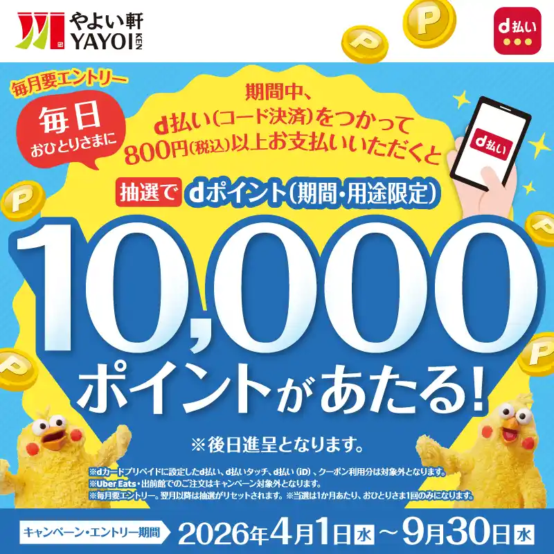 | 期間中、dポイントクラブ専用ページよりエントリーの上、「やよい軒」で合計800円以上(税込)のd払い(コード決済)ご利用で、毎日1名さまに10,000ポイントがあたる。 | ||||||||