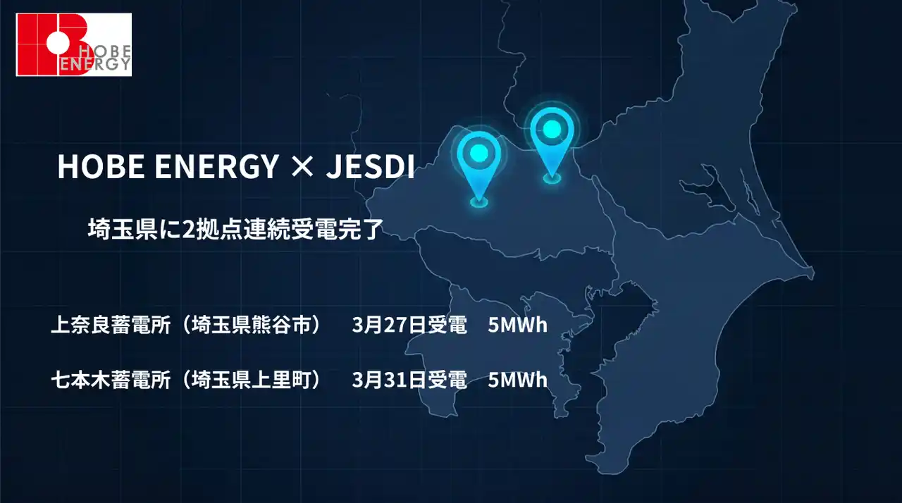 HOBE ENERGY株式会社(本社:東京都港区、代表取締役社長:沖野 強一、以下「HOBE ENERGY」)は、系統用蓄電池(BESS)の開発・推進を手がける日本蓄電開発機構株式会社(本社:東京都港区、代表取締役:星野 晶、以下「JESDI」)が埼玉県児玉郡上里町にて進めていた「七本木蓄電所」において、2026年3月31日に受電を完了したことをお知らせいたします。 |