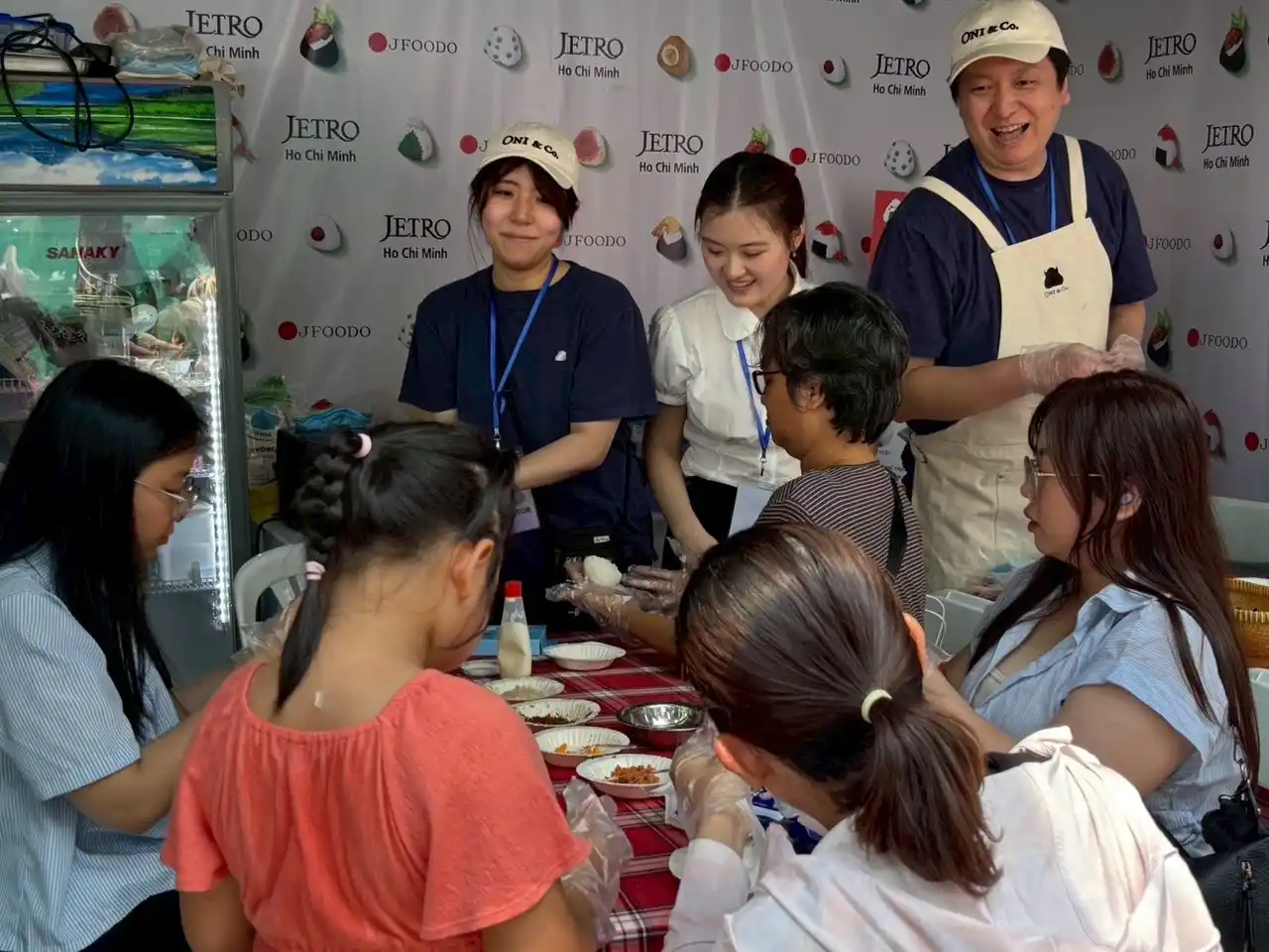 日本食品海外プロモーションセンター(JFOODO)およびジェトロ・ホーチミン事務所が主催・運営する「おにぎりワークショップ」は、日本産の米や食材(具材・海苔など)を使用し、来場者が自らおにぎり作りを体験できる人気企画です。 |