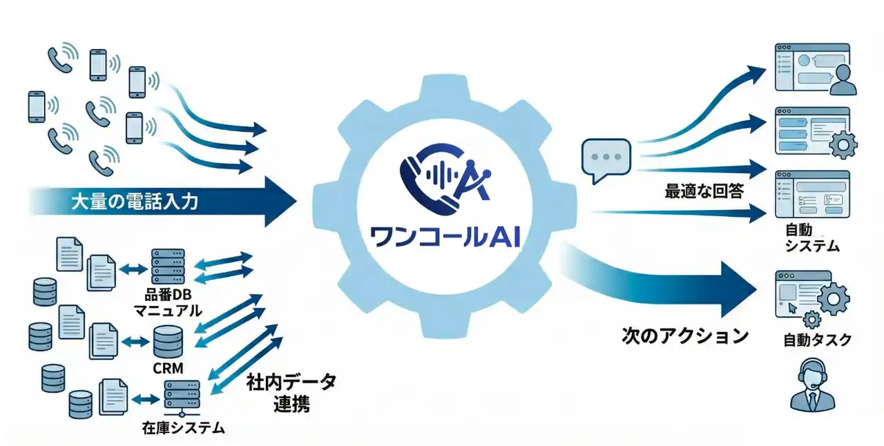 【共通頭脳】: 電話も、チャットも、FAXも。入り口が違っても「裏側のAI」は一つ。だからこそ、重複なく正確に実務をこなせます。 |