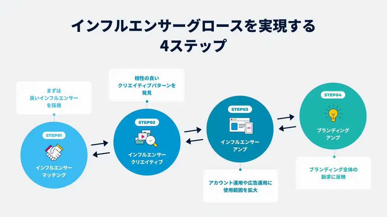 | Cast Me!では、クリエイティブ力の高いインフルエンサーとのマッチング、相性の良いクリエイティブパターンの発掘、二次利用による拡散、ブランディング全体への訴求反映といったインフルエンサーグロースモデルのステップ全体を支援可能。投稿を起点に広告やブランディング戦略までを設計し、ブランドを成長(グロース)に導きます。 | |||