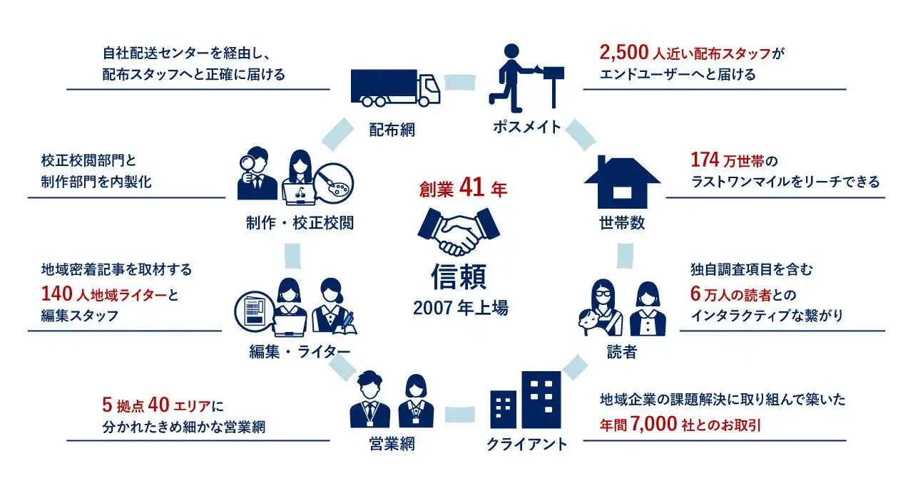 | 当社は、地域密着型の生活情報誌『ちいき新聞』の発行を軸に、情報発信および販売促進の総合支援事業を展開しており、年間約7,000社にサービスを提供しています。千葉県を中心に毎週発行している『ちいき新聞』は、専属の配布員により174万世帯へポスティングされ、創業以来41年以上にわたり配布を継続してきたことで、他に類を見ない九つのアセットを築いてきました。 | |||||||||