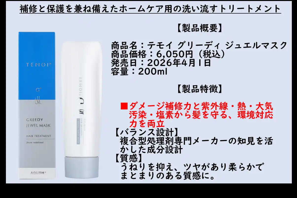 理美容室専売メーカー「AQUSH(アクシュ)」は、ダメージ補修力に紫外線・熱・大気汚染・塩素等の「環境的ダメージ」から守る成分を配合した次世代型トリートメント「テモイ グリーディ ジュエルマスク」を2026年4月1日より全国の取り扱い理美容室にて発売します。 |