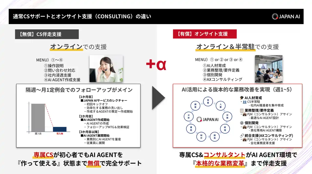 | AI導入の要件定義から実装・現場への定着まで、専任の担当者が一貫して支援します。AI活用に関するフォローアップだけでなく、CONOCが構想する新たなAIエージェントの開発計画を、JAPAN AIの技術知見と実装リソースにより加速し、建設業向けAIサービスの早期実現を共同で推進します。 | |||