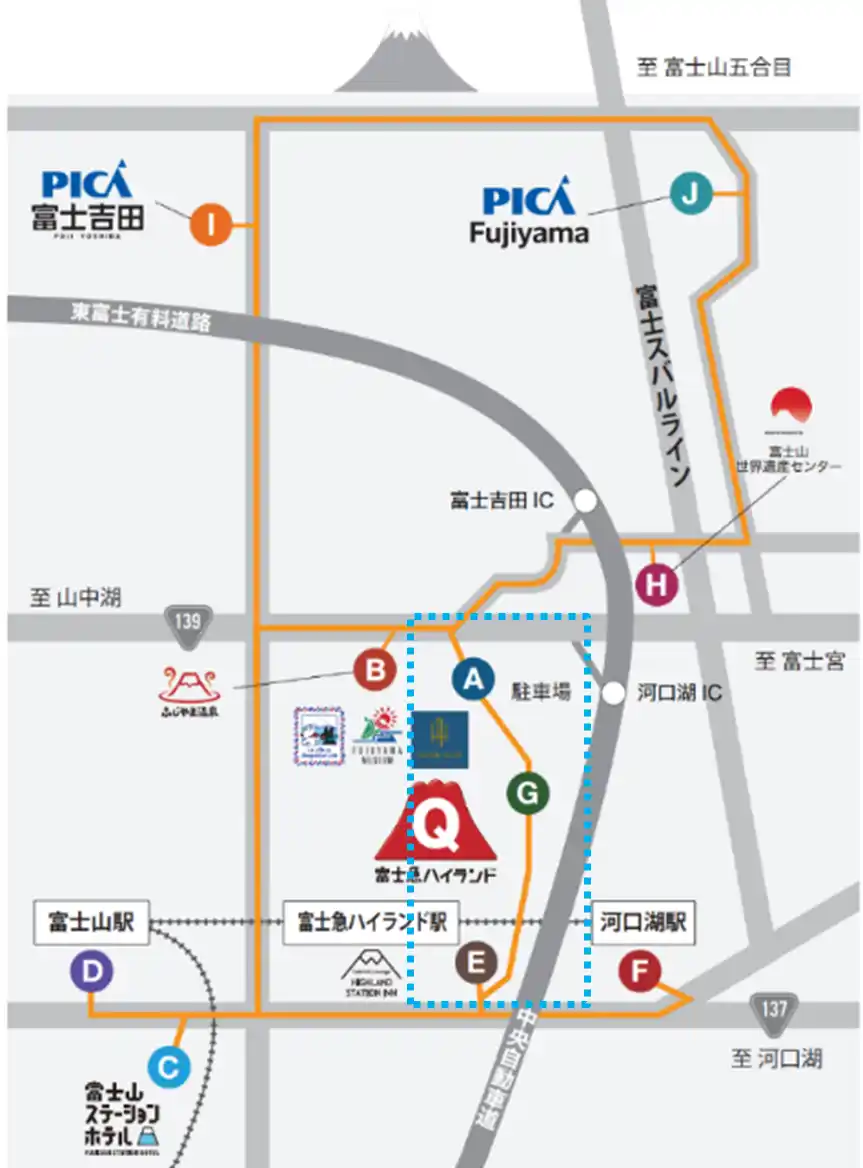 (E)ハイランドステーションイン ⇒ (G)富士急ハイランド ⇒(A)ハイランドリゾート ホテル&スパ |