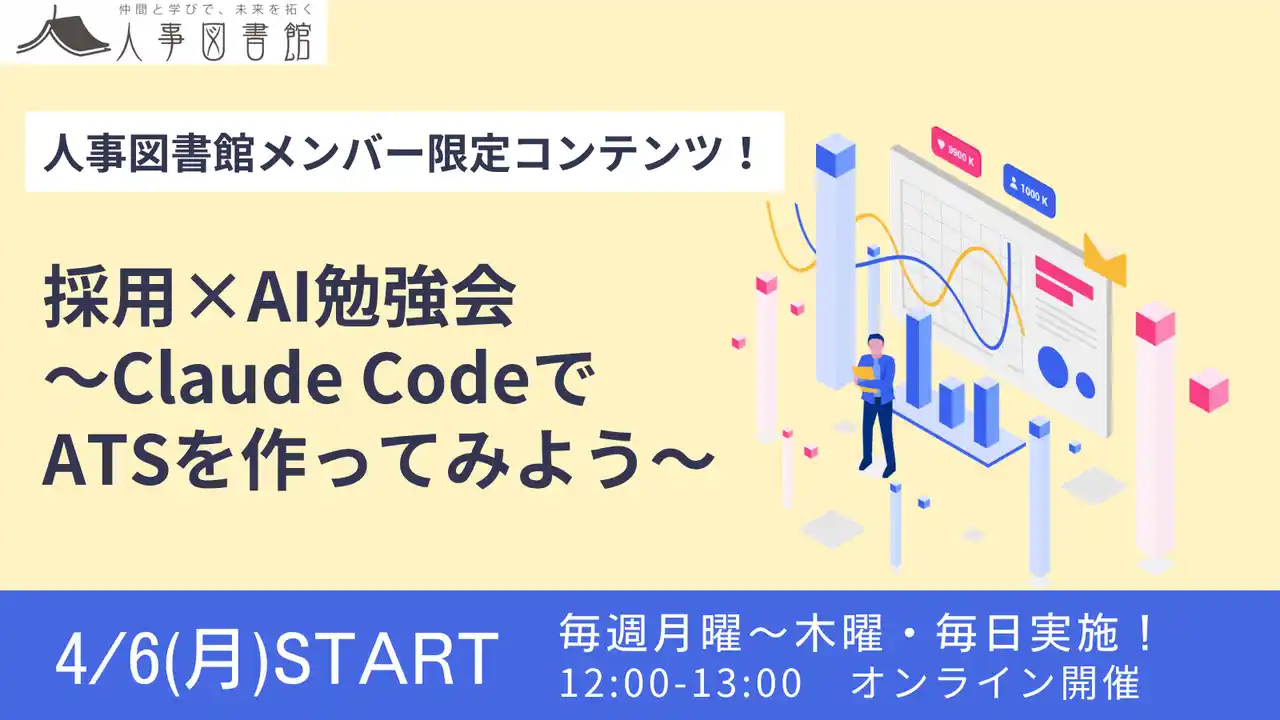 | 人事関連職が集まるコミュニティ「人事図書館」を運営する株式会社Trustyyle(本社:東京都中央区、代表取締役:吉田洋介)は、採用担当者の実務を支える新サービス「採用図書館」の新企画として、「採用×AI勉強会 ~Claude CodeでATSを作ってみよう~」を2026年4月6日よりスタートします。 | ||||||||||||