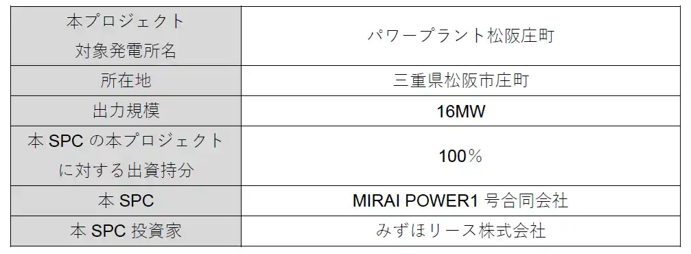本プロジェクトは、本SPCを通して出資参画した青森県上北郡六ヶ所村、茨城県高萩市安良川、三重県鳥羽市堅子町、三重県津市白山町、熊本県球磨郡錦町、三重県松阪市嬉野釜生田町、岩手県久慈市侍浜町、鹿児島県指宿市山川大山において稼働する8か所の特別高圧太陽光発電所に続く第六弾として、三重県松阪市庄町において稼働する1か所の特別高圧太陽光発電所(出力規模16MW)を対象としており、各発電所を合わせた出力規模は累計244MWとなります。 |