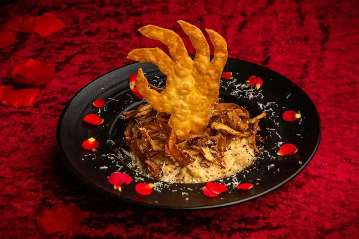 暗闇から運ばれる漆黒の皿に突き立つ恐ろしげな手にたじろいだその瞬間。不意に鼻をかすめる蠱惑的な薫り…正体は世界3大珍味に数えられるトリュフと、イタリアの伝統的なチーズとして名高いペコリーノ。種々のきのこ達とチーズが奏でる美食のオーケストラこそ、貴方を絡め取ろうとする”魔の手、なのかも。 |