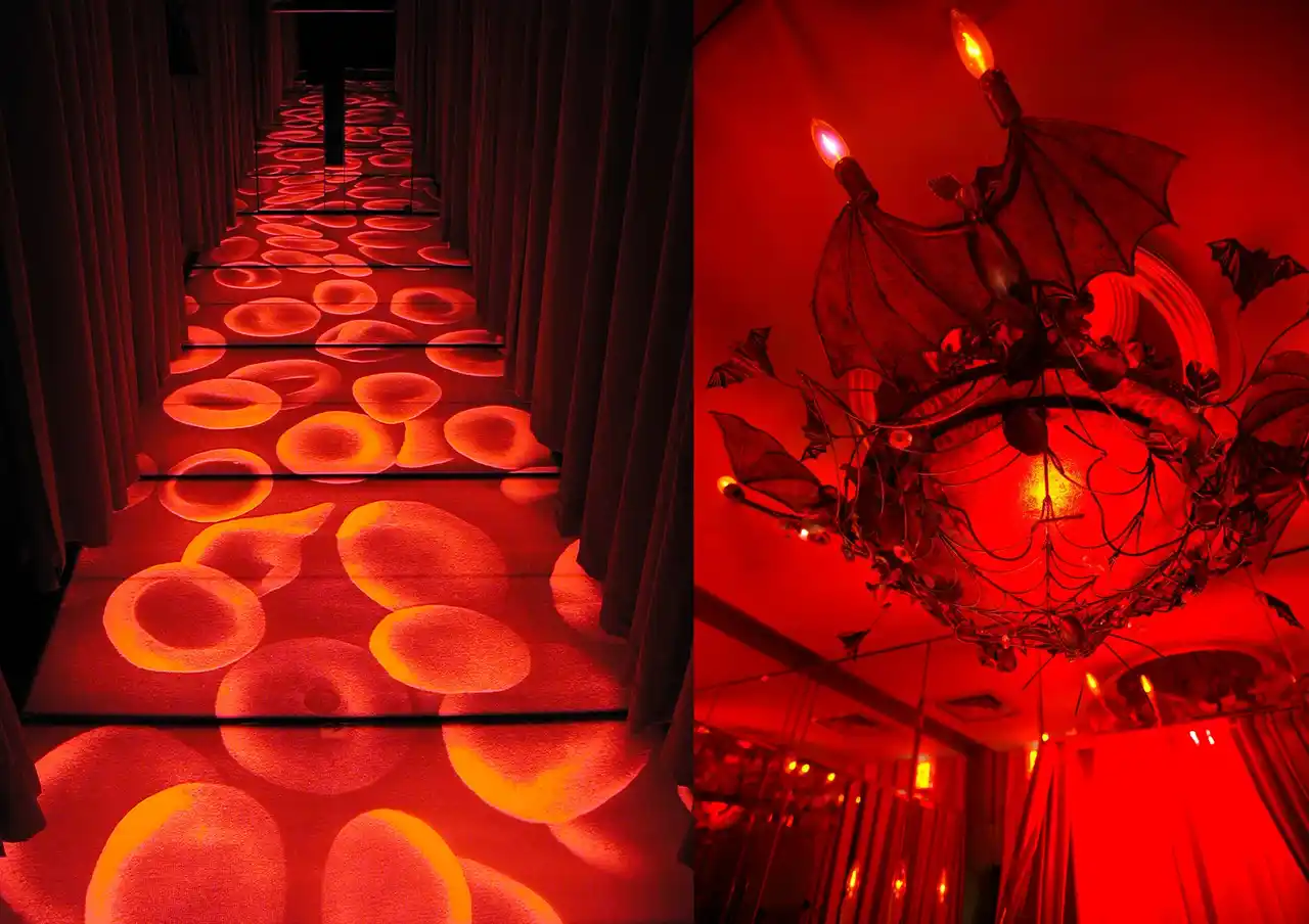 「魔除の十字架」が埋め込まれたフロントスペースに迎えられ進んでいくと、紅いベルベットのカーテンに取り囲まれ、赤血球が浮かび上がる廊下が伸びています。 |