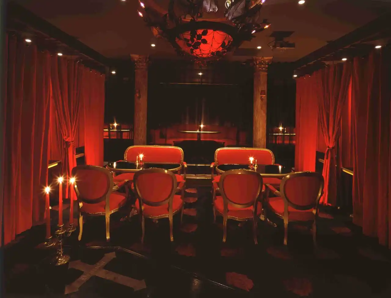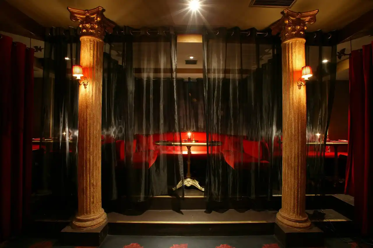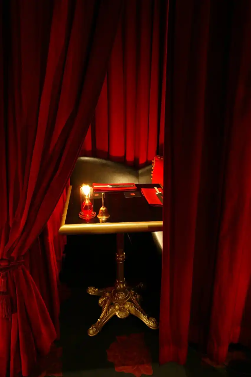 紅く厚いベルベットカーテンで仕切られたL字型のシート。気になるあの人と距離を近づけたい時に…。 |