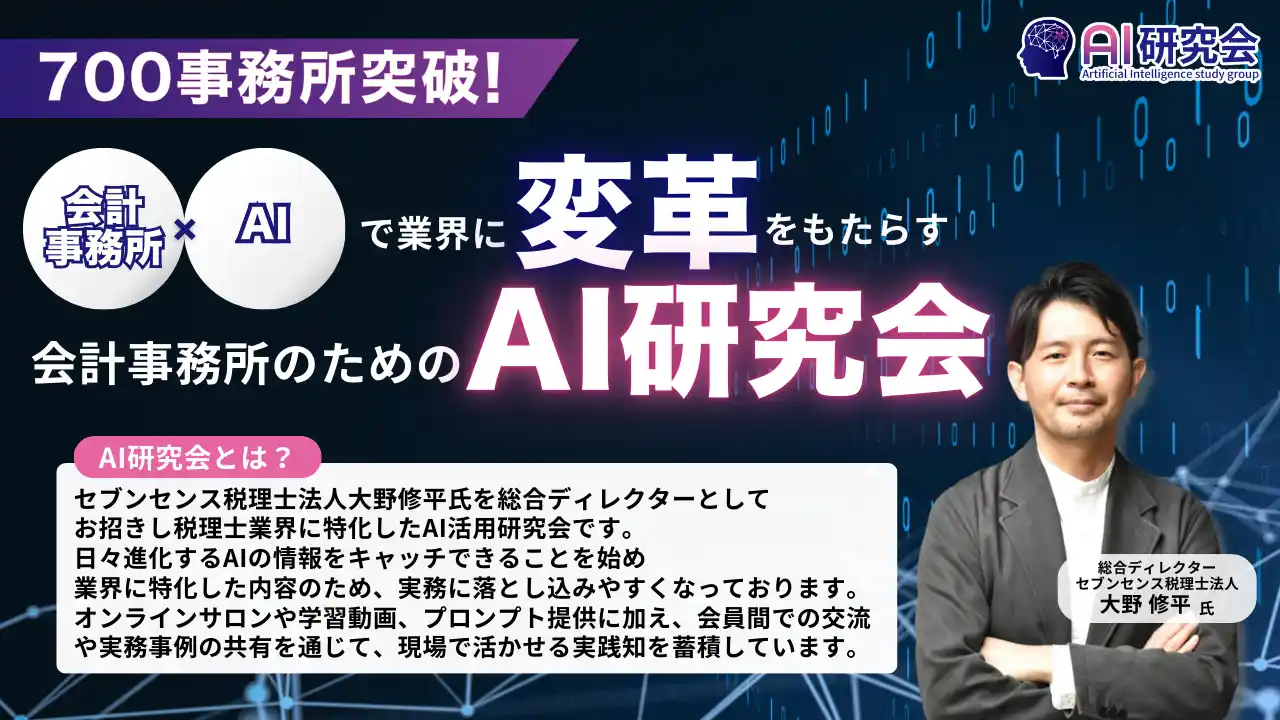 セブンセンス税理士法人大野修平氏を総合ディレクターに迎え、会計業界に特化したAI活用を支援する研究会です。日々進化するAI情報のキャッチアップ、オンラインサロンや学習動画、実務で使えるプロンプト提供、会員間での交流や実務事例の共有を通じて、現場で活かせる実践知を蓄積しています。 |