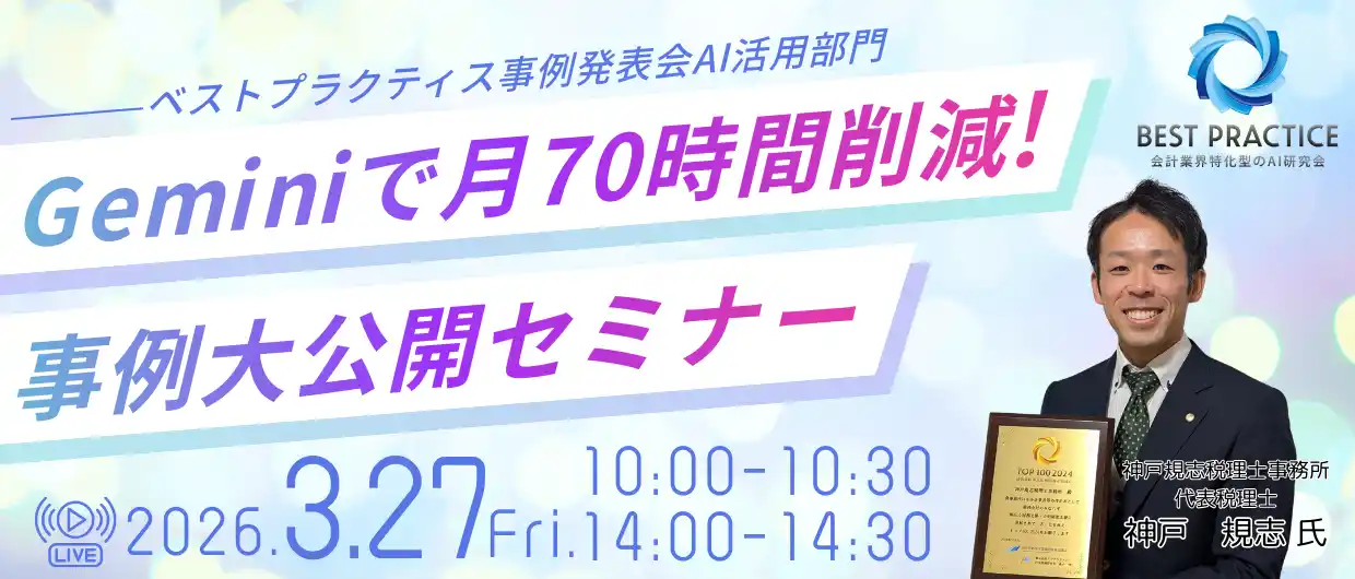株式会社エフアンドエム(本社:大阪府吹田市、代表取締役社長:森中 一郎)が運営する「AI研究会」において、ベストプラクティス賞 AI活用部門(以下、AI研究会ベストプラクティス賞)」を開催し、初の受賞事務所として、兵庫県の神戸規志税理士事務所(代表:神戸 規志 氏)を選出しました。 |
