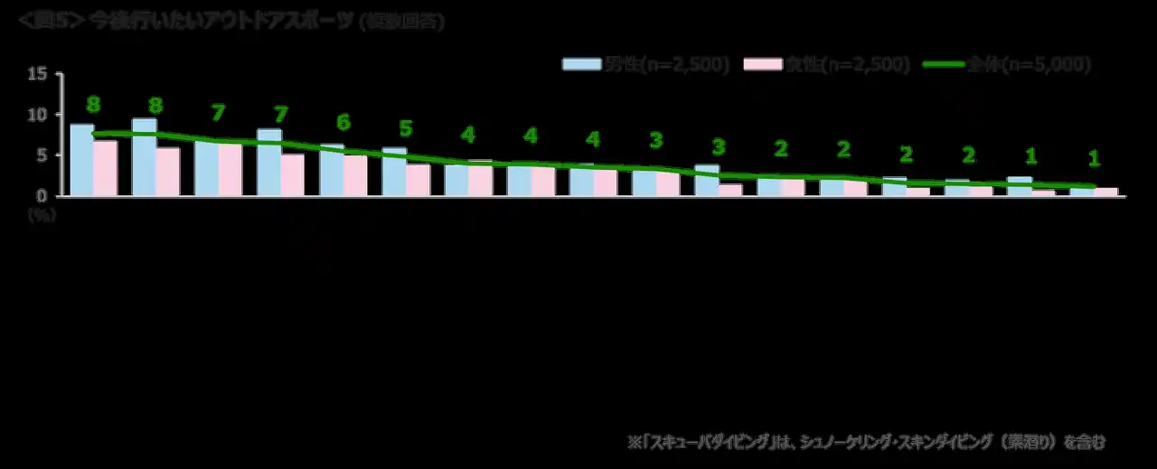今後行いたいものは、男性が「釣り」「登山・トレイルランニング」「サイクリング」で8~9%、女性は「登山・トレイルランニング」「トレッキング・ハイキング」「釣り」で6~7%。<図5> |