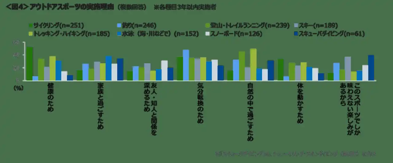 3年以内に実施したアウトドアスポーツの種別ごとに実施理由を聴取した。全般的に「自然の中で過ごす」「気分転換」「健康」が高い。特に「健康」はサイクリング、「家族と過ごす」は水泳(海・川などで)、「友人・知人と関係を深める」はスノーボード、スキー、「自然の中で過ごす」はトレッキング・ハイキング、登山・トレイルランニングの実施者で高い。<図4> |
