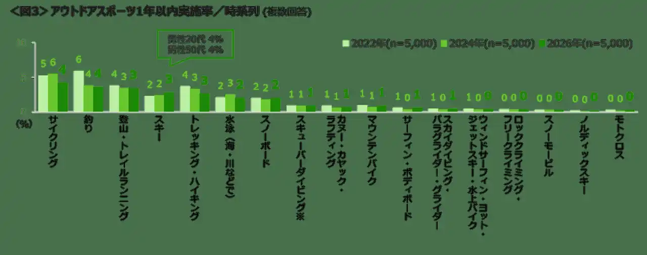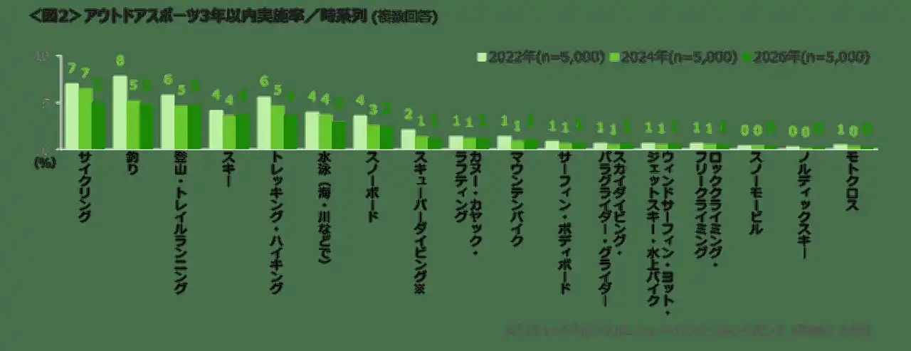 2022年、2024年と比較し、3年以内アウトドアスポーツ実施率は各種ともにやや低下か同率が多い。<図2> |