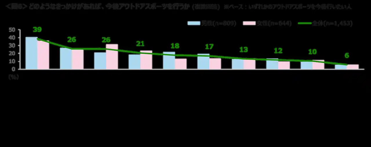 アウトドアスポーツを行う時のきっかけは、「もっと時間ができたら」が最多の39%、「収入があがったら」「一緒にしてくれる人が見つかったら」「体力がついたら」が2割台。女性は「一緒にしてくれる人が見つかったら」が36%と2番手のきっかけとしてあがった。<図6> |