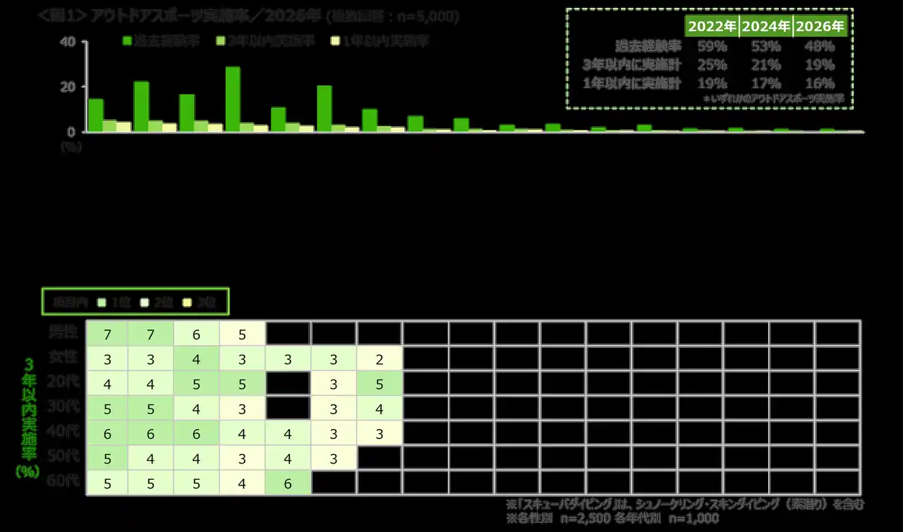 株式会社クロス・マーケティング(本社:東京都新宿区、代表取締役社長兼CEO:五十嵐 幹)は、全国47都道府県に在住する20~69歳の男女5,000人を対象に「アウトドアに関する調査(2026年)」を実施しました。今回はアウトドアスポーツの種類別に、実施率、実施理由、今後の意向、実施するきっかけなどを聴取し、分析をしました。 |