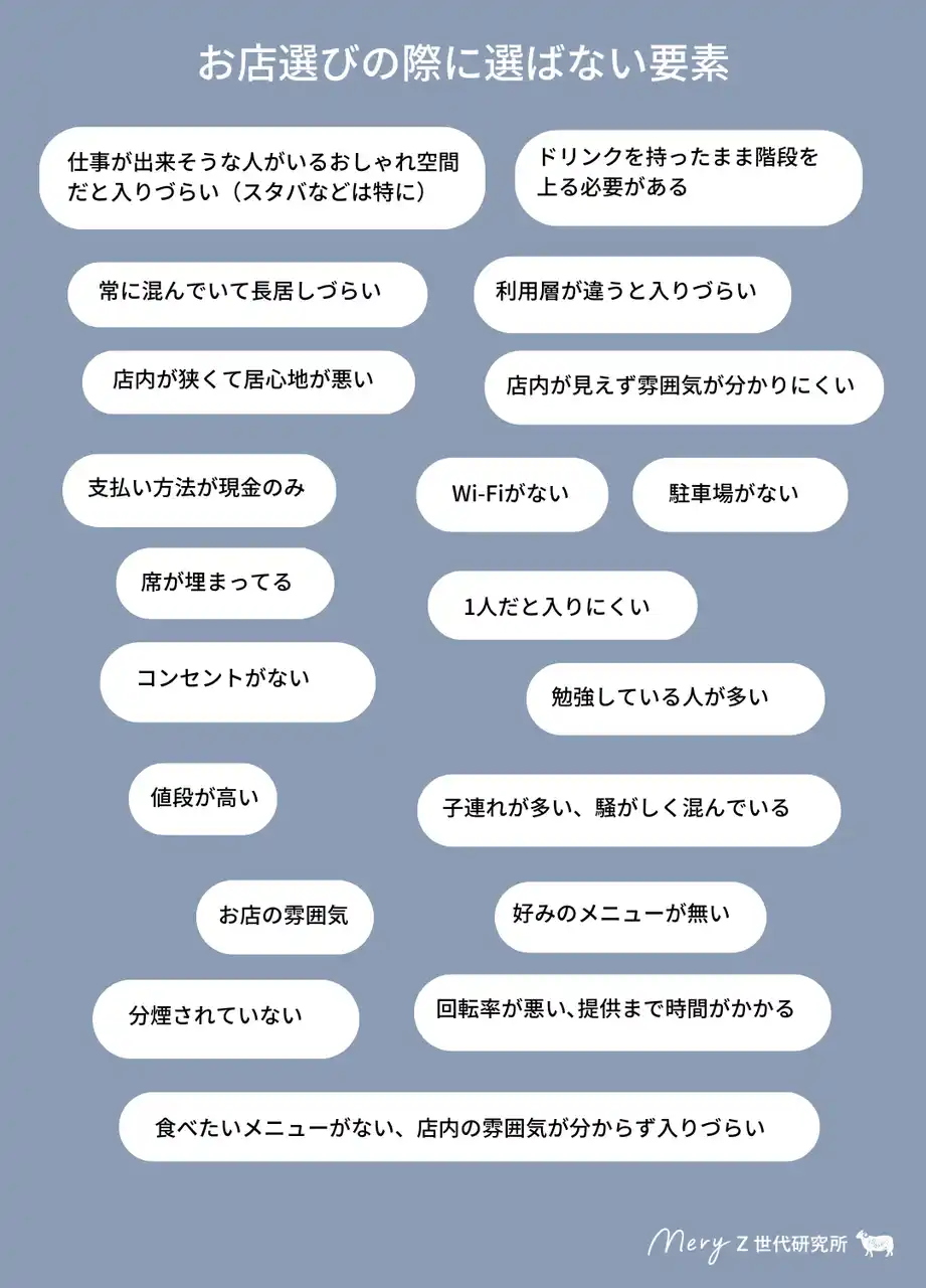 また、「お店選びの際に選ばない要素」のアンケートでは、価格志向のコメントよりも「混雑」「騒音」「スペース」といった回答が多く見られる結果となった。 |