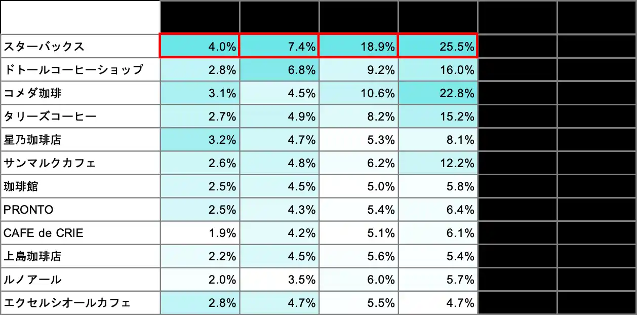 また、好意度のアンケートでは、最も高い「5」の項目で「スターバックス(33.4%)」が1位となった一方、「5」「4」の合計で「スターバックス(63.2%)」に次いで「コメダ珈琲(61.4%)」の2ブランドが6割を超えるという結果に。 |